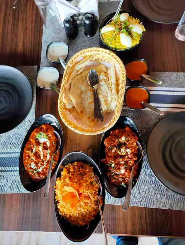 Restaurant‑guide descriptions specifically mention Indian dishes with vegetarian options, including veg biryani, dal fry, paneer curries and plain/steam rice. This ensures that both vegetarian and non‑vegetarian diners can find suitable choices.