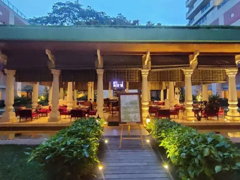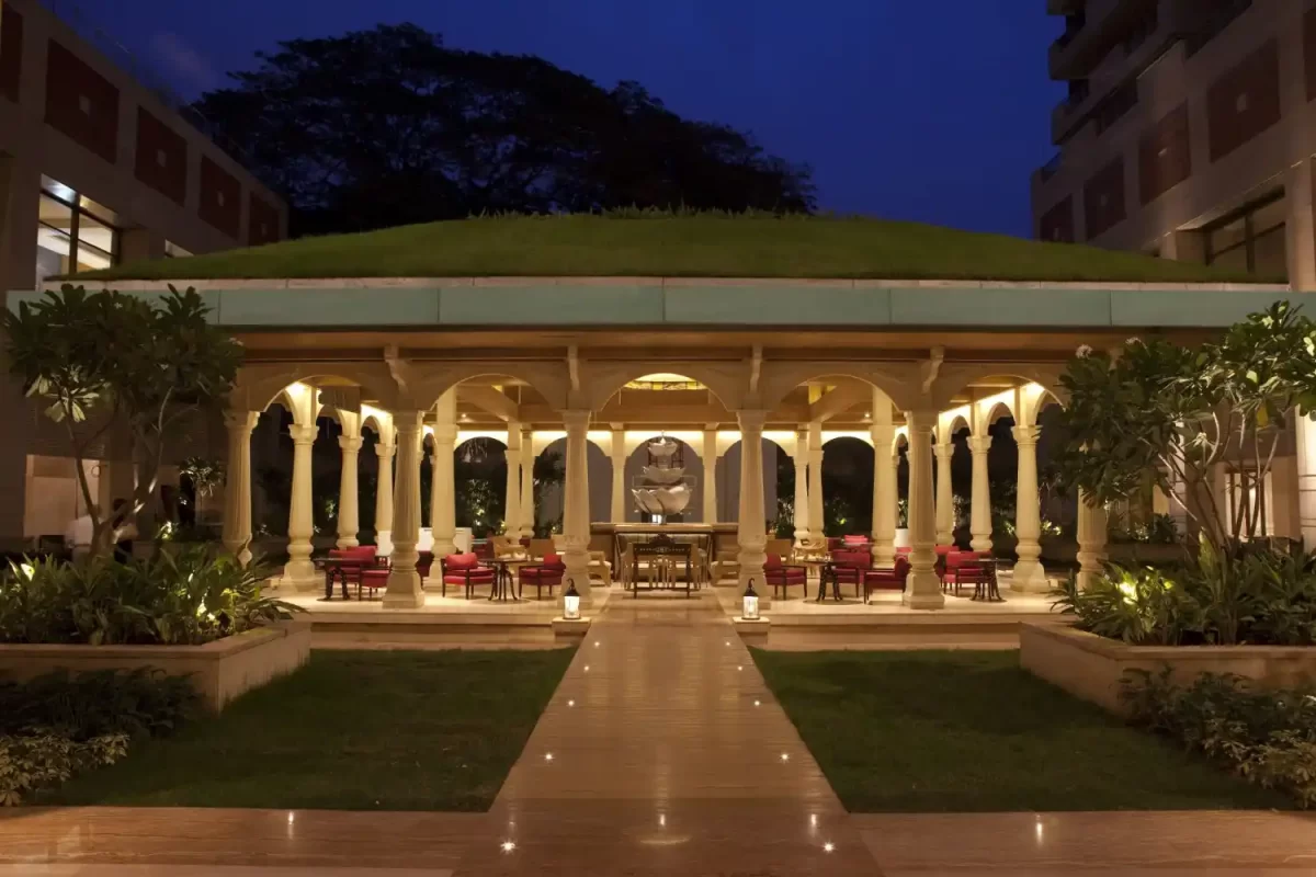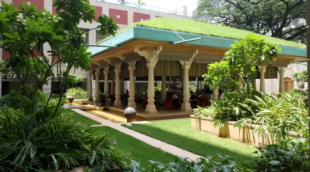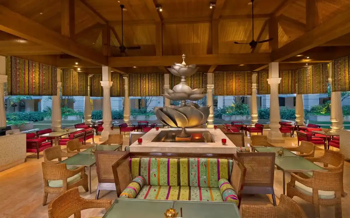 Lotus Pavilion at ITC Gardenia is a signature open‑air restaurant that captures the spirit of Bengaluru’s pleasant weather in a luxurious yet relaxed setting. Inspired by Tipu Sultan’s summer palace, the multi‑pillared pavilion sits in the central courtyard of ITC Gardenia, with sloping grass‑covered roofs, surrounding water bodies, and breezy walkways that create an elegant, resort‑like ambience in the middle of the city. Guests can lounge here from breakfast through late night, choosing from an extensive beverage list that ranges from handcrafted cocktails and premium spirits to fine wines, beers, fresh‑pressed juices and artisanal coffees. The food menu brings together international favourites and gourmet bar bites, including Continental and North Indian dishes, comfort bowls, sandwiches, grills, pizzas, and carefully plated desserts, with vegetarian, vegan and gluten‑free options thoughtfully marked for conscious diners. Many visitors praise the courteous, attentive service and the calm, conversation‑friendly environment, which makes Lotus Pavilion a preferred spot for business meetings, relaxed catch‑ups, and romantic evenings alike. With pricing that reflects a five‑star luxury hotel, guests typically spend between ₹1,500 and ₹3,000 per person for food and beverages, especially when pairing tapas with cocktails or wines. Its strategic location on Residency Road near Richmond Circle, close to MG Road, UB City and key corporate hubs, makes the restaurant easy to access for both in‑house guests and city residents seeking refined outdoor dining.